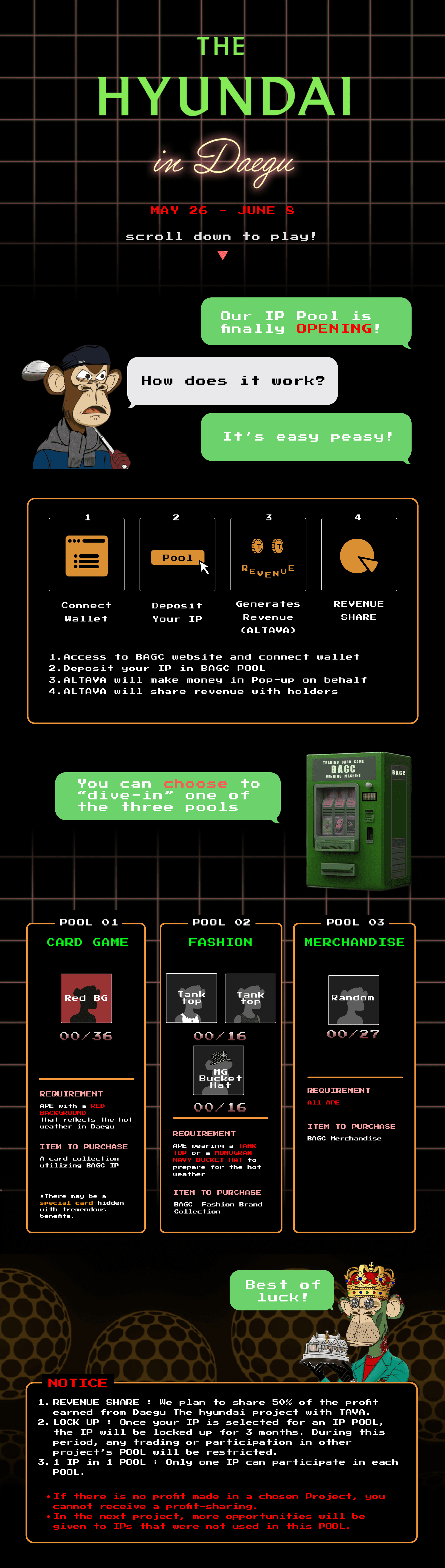 1. In order to maximize the value to BAGC holders, Altava has created a BAGC IP Management Department. The BAGC IP Management Department’s mandate is to find and license BAGC IP to various brands and merchandise partners. The team will also be responsible for all the after-sales, including management, reporting, and distribution of revenue generated from IP licensing.